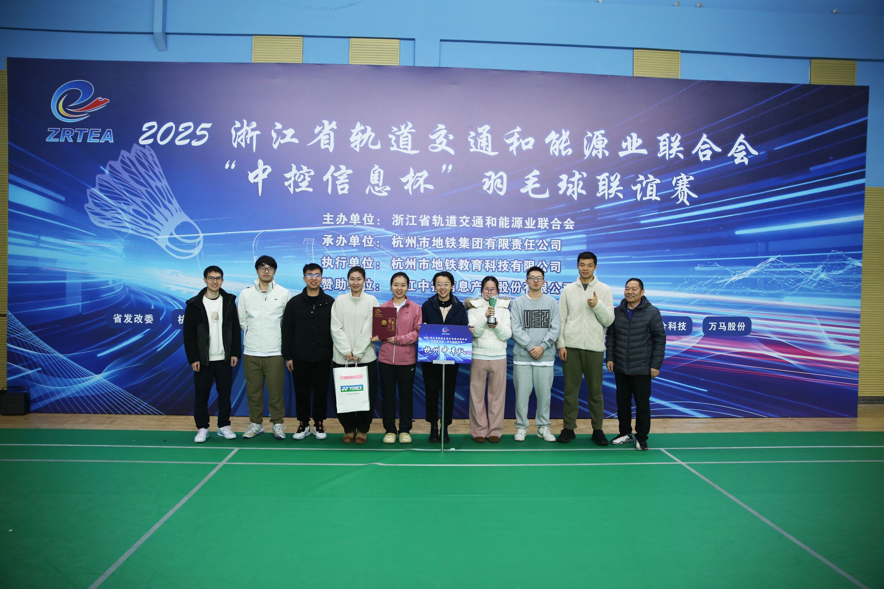 闭幕式上,浙江省发展规划研究院院长李军、浙江省轨道交通和能源业联合会常务副会长马德富、杭州地铁教育科技有限公司副总经理金丽君,浙江中控信息产业股份有限公司董事、高级决策顾问章如峰为获奖队伍郑重颁发了奖杯与荣誉证书,见证荣耀时刻的同时,也向所有参赛选手的全力以赴致以敬意。本次“中控信息杯”迎新羽毛球联谊赛,不仅为全省轨道交通和能源行业的羽毛球爱好者搭建了交流切磋、增进友谊的平台,更有效激发了广大职工参与体育锻炼的热情,丰富了业余文化生活。联合会作为行业交流的桥梁纽带,本次赛事既展现行业风采,更凝聚奋进力量,为深化行业合作、凝聚发展共识注入了新活力。